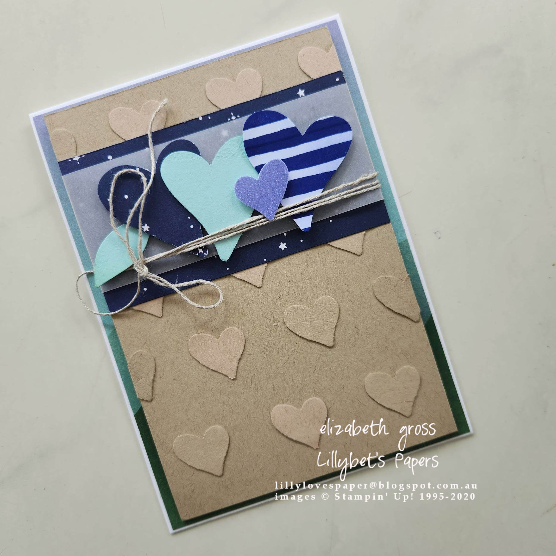 This card uses the Country Bouquet Punch and the beautiful Enjoy the Journey DSP. The background strip and one of the hearts are punched from the gorgeous starry sky sheet of DSP, and the background mat is from the reverse which is one of the mountain scene pages. Such beautiful bright colours.